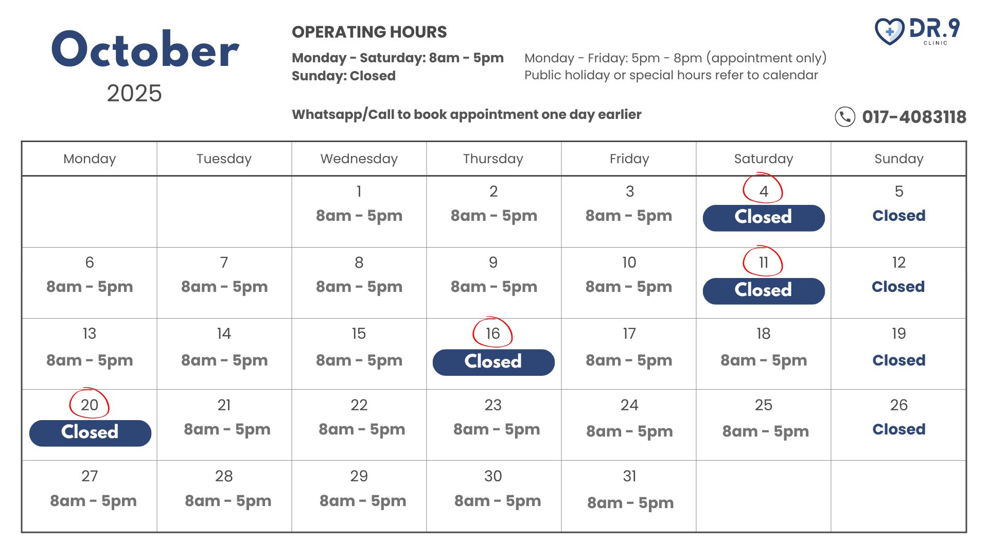 Dr. 9 Clinic is a medical clinic located at USJ 9, Subang Jaya, Selangor. We are open from Monday to Saturday, 8am to 5pm (special hours refer to calendar).ย ย